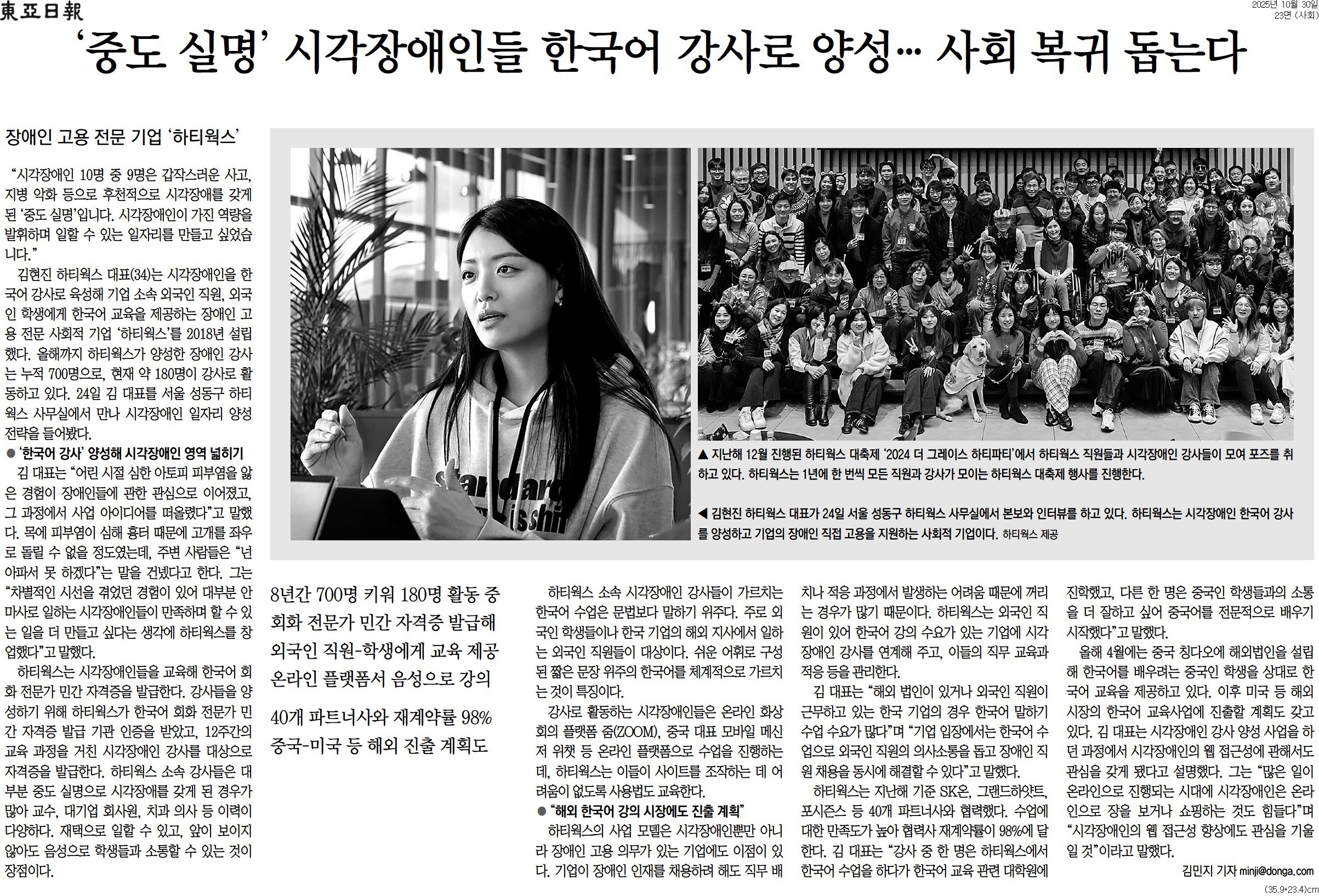[동아일보 행복나눔] ‘중도 실명’ 시각장애인들 한국어 강사로 양성… 사회 복귀 돕는다 등록일 : 2025-10-30 https://www.donga.com/news/Culture/article/all/20251030/132663260/2