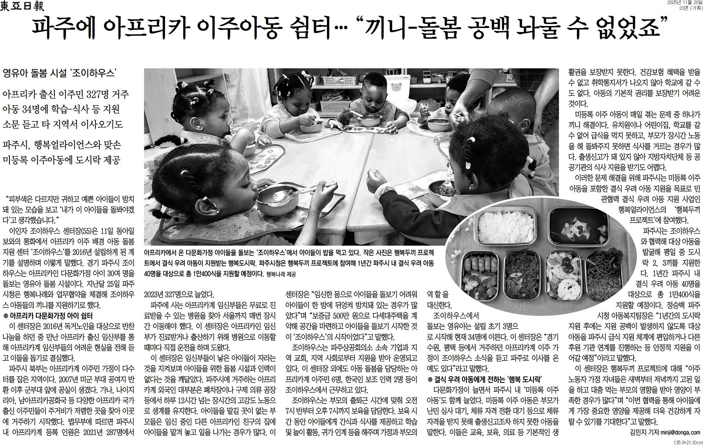 [동아일보 행복나눔] 파주에 아프리카 이주아동 쉼터… “끼니-돌봄 공백 놔둘 수 없었죠” 등록일 : 2025-11-20 https://www.donga.com/news/Society/article/all/20251119/132802544/2