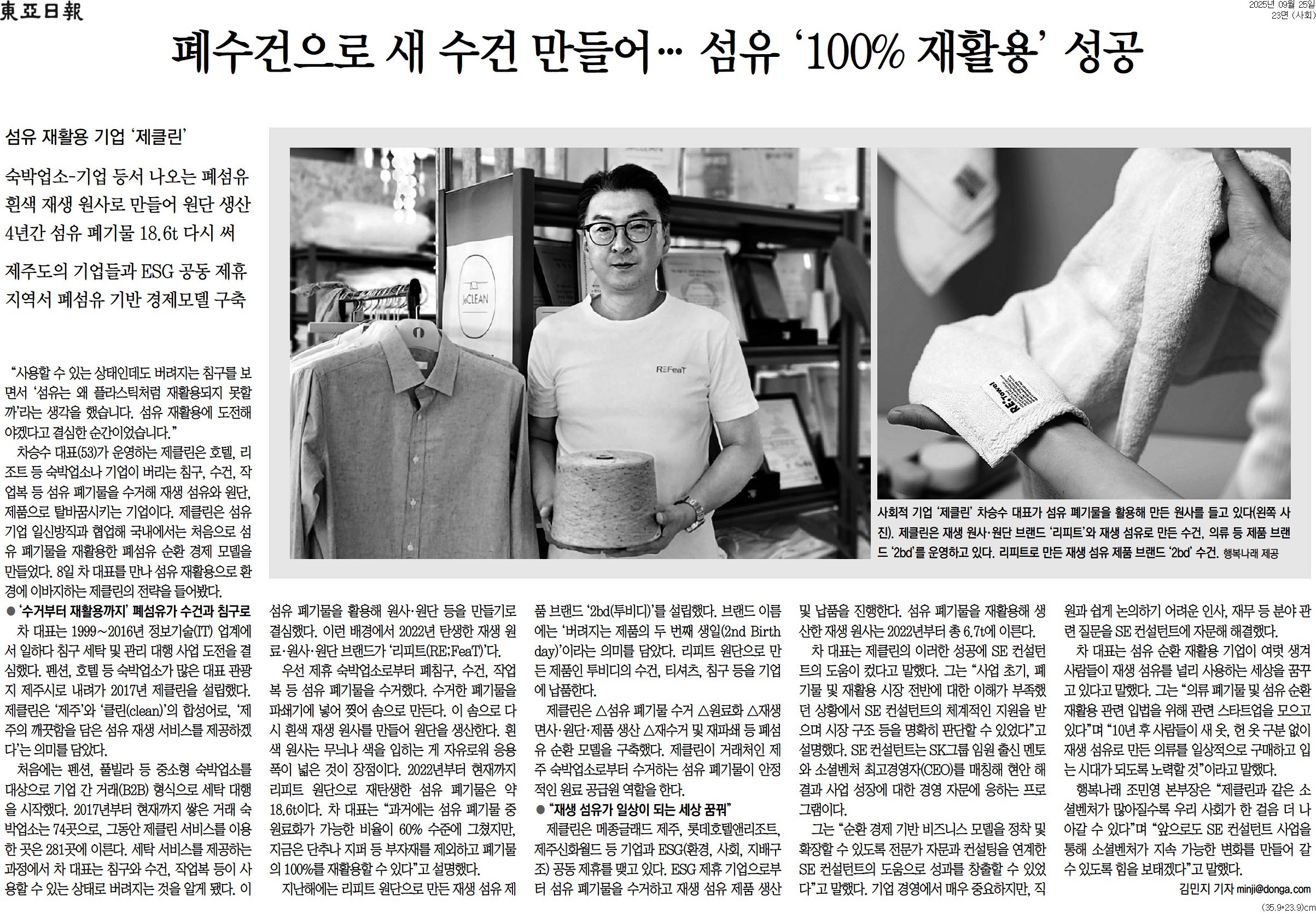 [동아일보 행복나눔] 폐수건으로 새 수건 만들어… 섬유 ‘100% 재활용’ 성공 등록일 : 2025-09-25 https://www.donga.com/news/Society/article/all/20250924/132458531/2